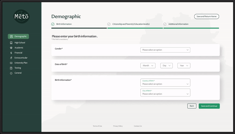 'ApplyMCF' is a concept proposed by Meto to the MasterCard Foundation, aimed at establishing a streamlined platform for students to apply for scholarships at MCF-funded university programs in collaboration with Meto. This design proposal showcases the platform’s potential to facilitate the application process and enhance collaboration between Meto, MCF, and partner universities.