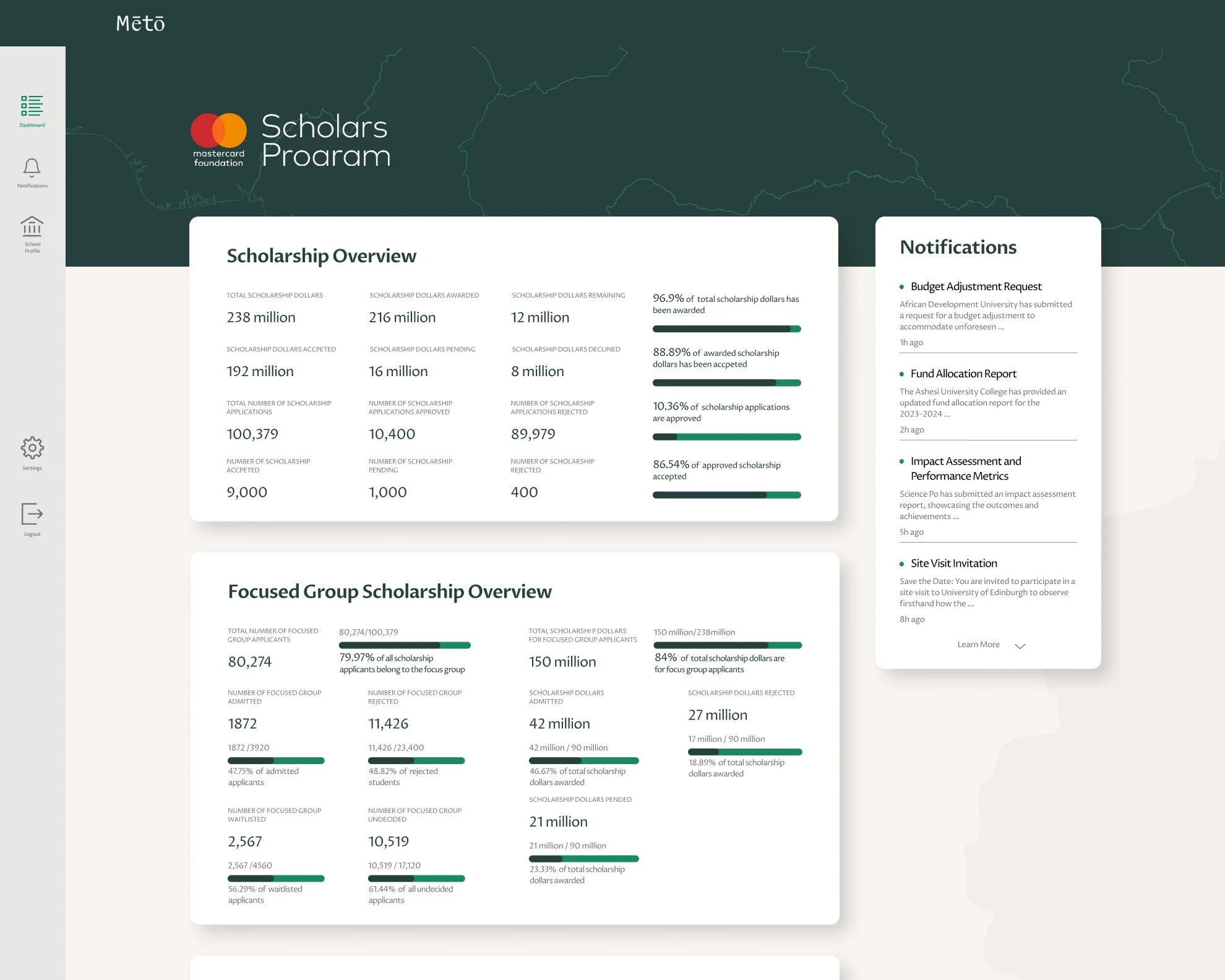 This interface provides an overview of the key data Mastercard Foundation uses to track the distribution of scholarship funding.