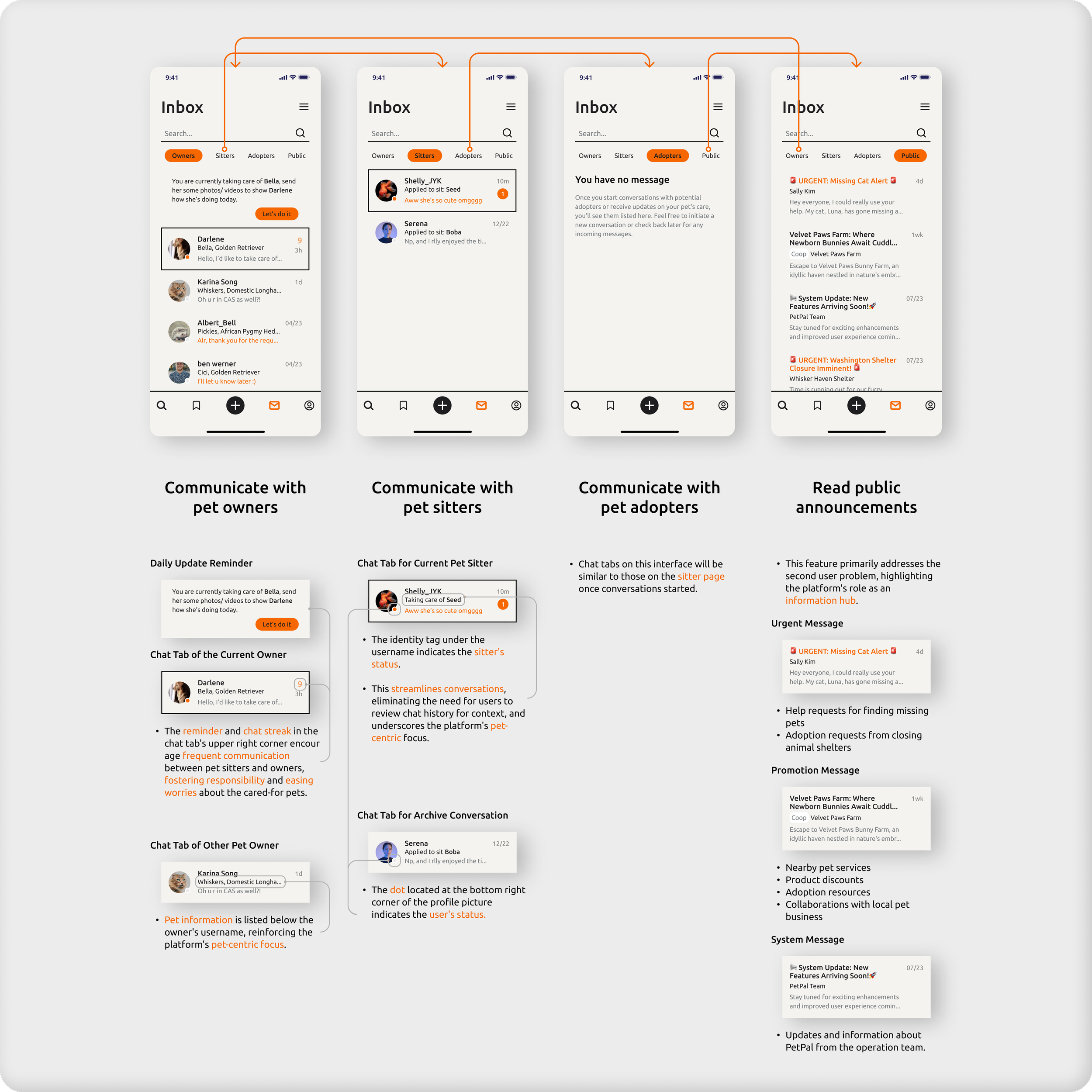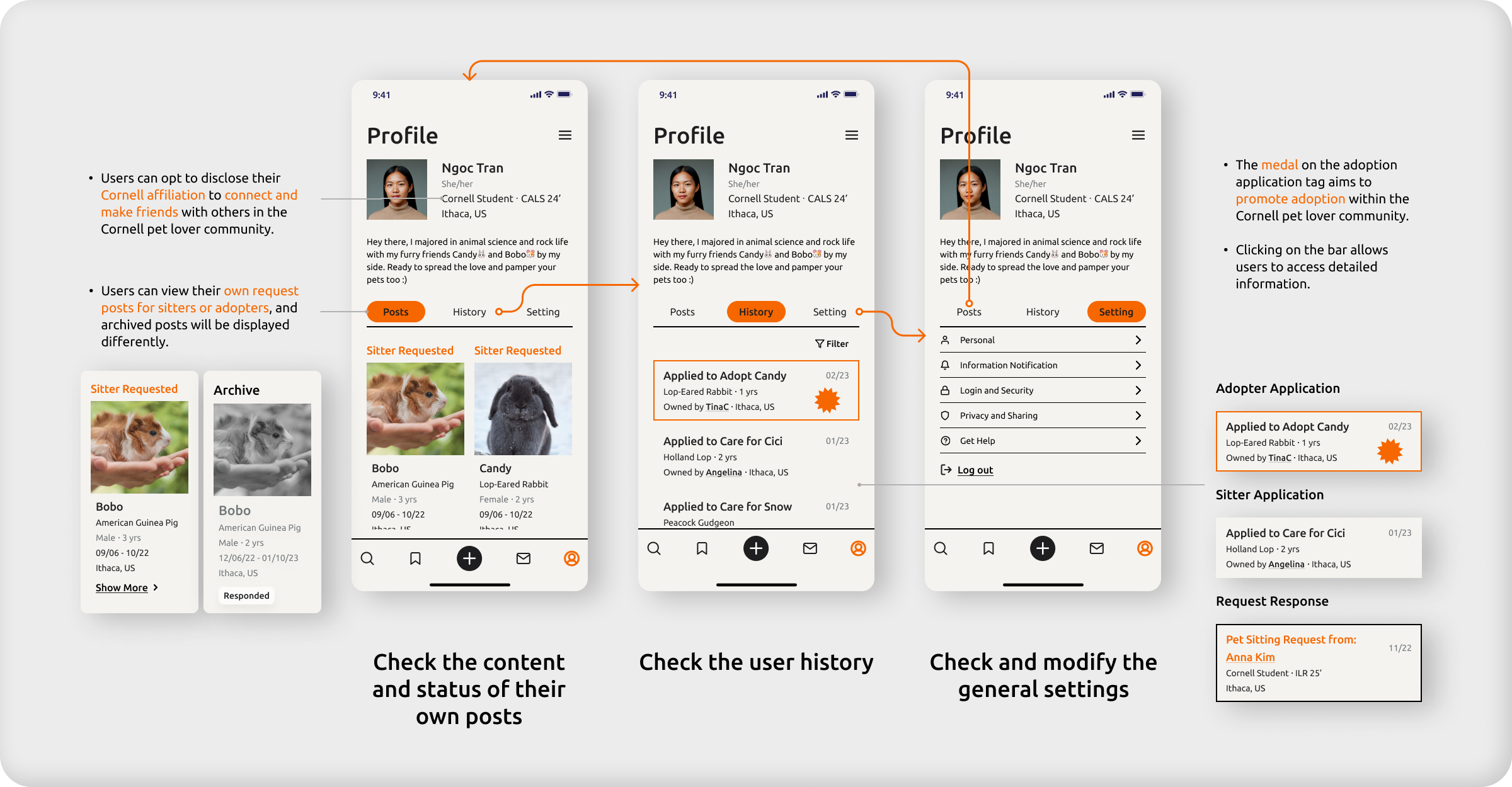 I conceptualized and refined features while keeping the persona Darlene, a Cornell pet lover seeking dog sitters over the break, in mind. This user-centric approach ensured a smooth experience, extending to user flows for pet owners finding sitters or adopters.